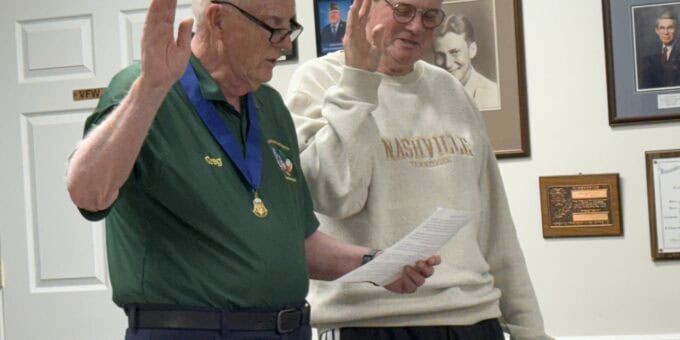 John Owens, right, recites the oath of AOH membership led by Division President Greg Gibbons.
