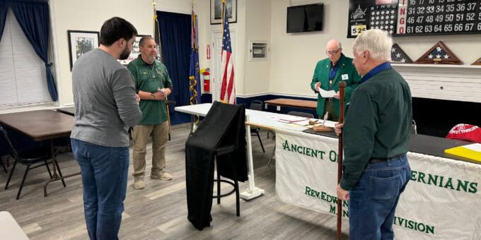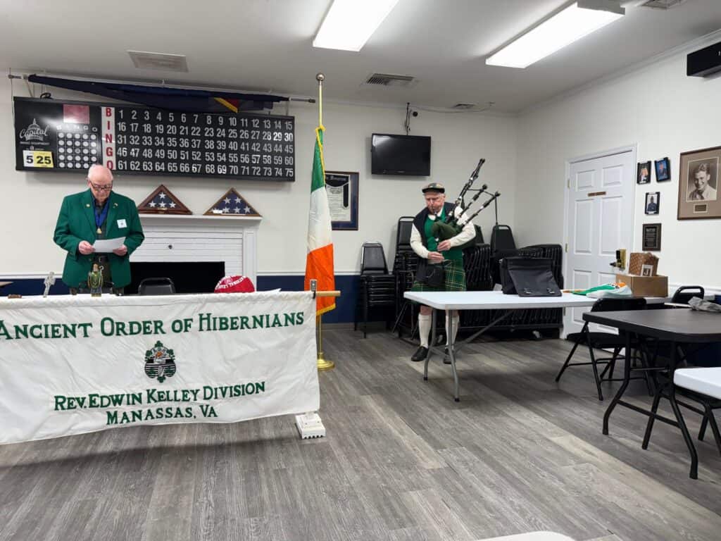 The Deceased Members Ceremony was conducted. A black cloth was draped over an empty seat. A roll call of our deceased members was read aloud. Jerry Laffey played “Amazing Grace” on the bagpipes. Prayers were said for the repose of their souls.